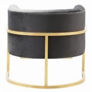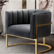 Trendsetting colors and metal detailing make this chair the new must-have. Fabulously chic from any angle, this collection will no doubt dazzle in any room.