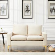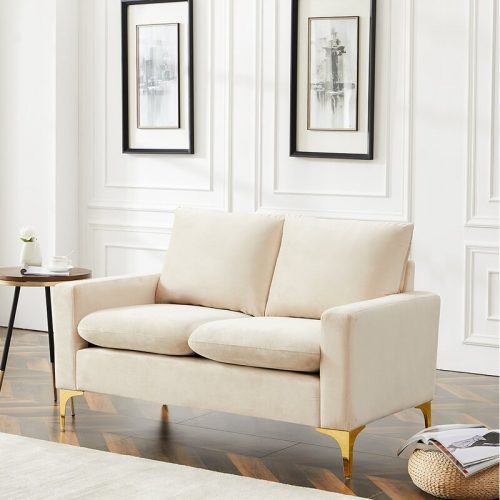 This is a two seaters sofa of the elegant style of design. Crafted from solid wood, it stands atop tapered golden metal legs and features a track-arm design wrapped in polyester velvet upholstery for a textured appearance. it offers you and your guests a comfortable place to sit, whether you’re chatting over coffee or enjoying a movie marathon.