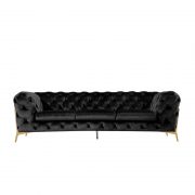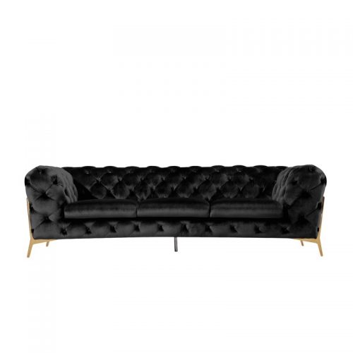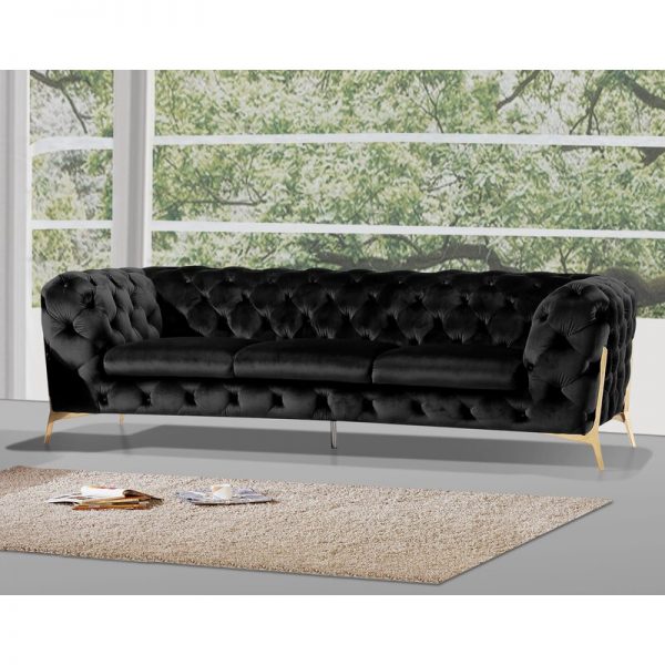 This Romania Chesterfield is a Neat and smart in posh Velour fabric upholstery, it has a boxy look featuring tufted seatbacks with buttons and plush cushioned seats. It features a continuous back and arm design with the arms having softened edges. Drawing attention are the right-angled gold metal legs with one side pressed on the side of the arms that complemented the upholstery. If you want to give your living space a refined comforting look, the Divani Casa Randal modern fabric sofa is the best choice!