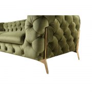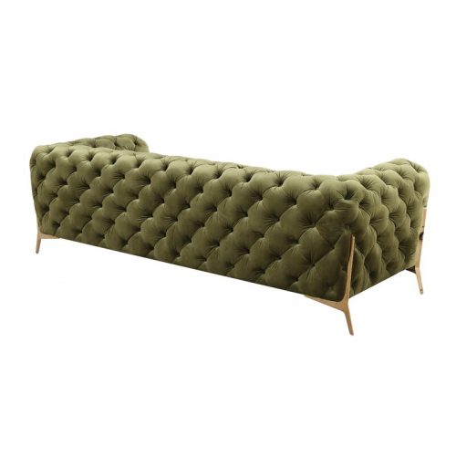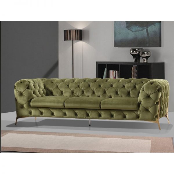 This Romania Chesterfield is a Neat and smart in posh Velour fabric upholstery, it has a boxy look featuring tufted seatbacks with buttons and plush cushioned seats. It features a continuous back and arm design with the arms having softened edges. Drawing attention are the right-angled gold metal legs with one side pressed on the side of the arms that complemented the upholstery. If you want to give your living space a refined comforting look, the Divani Casa Randal modern fabric sofa is the best choice!