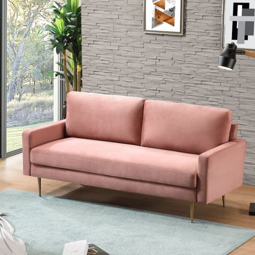 This is a three seaters sofa of the elegant style of design. Crafted from solid wood, it stands atop tapered golden metal legs and features a track-arm design wrapped in polyester velvet upholstery for a textured appearance. it offers you and your guests a comfortable place to sit, whether you’re chatting over coffee or enjoying a movie marathon.